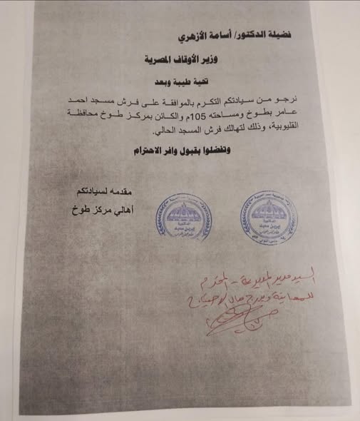 تقدمت النائبة د.إيرين سعيد بطلب إلى وزير الأوقاف لإدراج مسجد أحمد عامر بطوخ قليوبية للفرش، وذلك بمناسبة حلول شهر رمضان الكريم.