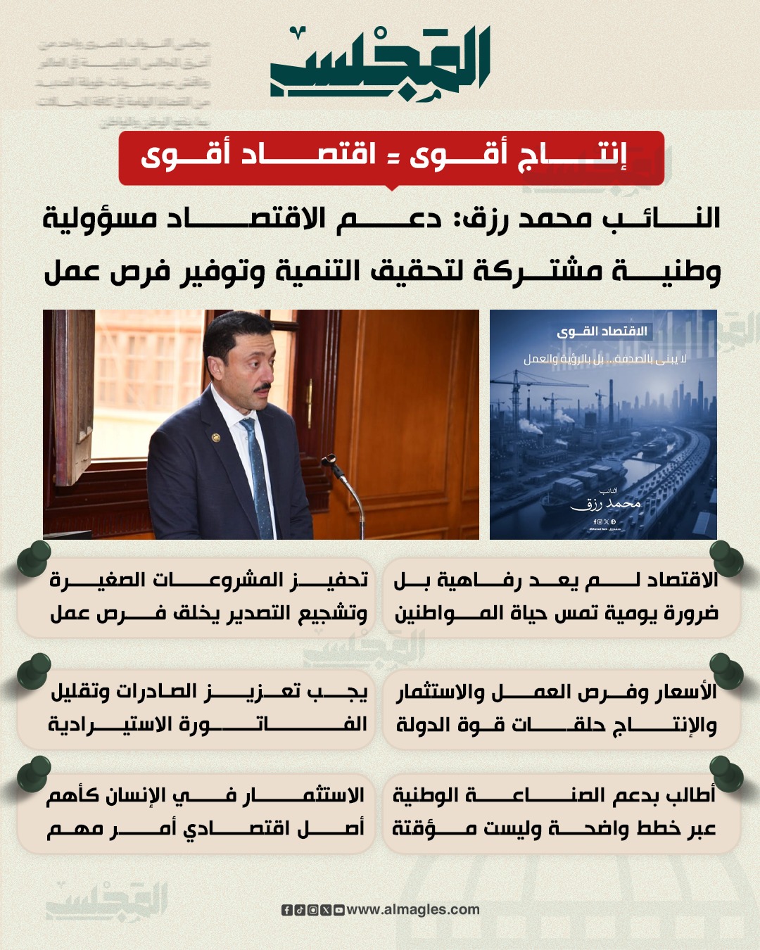 أكد النائب محمد رزق عضو مجلس الشيوخ أن الحديث عن الاقتصاد لم يعد رفاهية، بل أصبح ضرورة يومية تؤثر على حياة كل مواطن من حيث الأسعار، فرص العمل، الاستثمار والإنتاج، كلها حلقات مترابطة ضمن ما يسميه “قوة الدولة”.