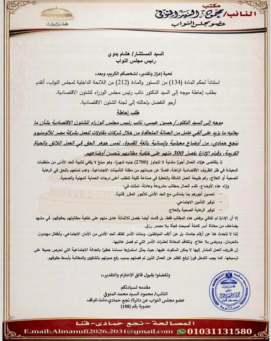 المنوفي يطالب بالتدخل الفوري لبحث أوضاع العمال