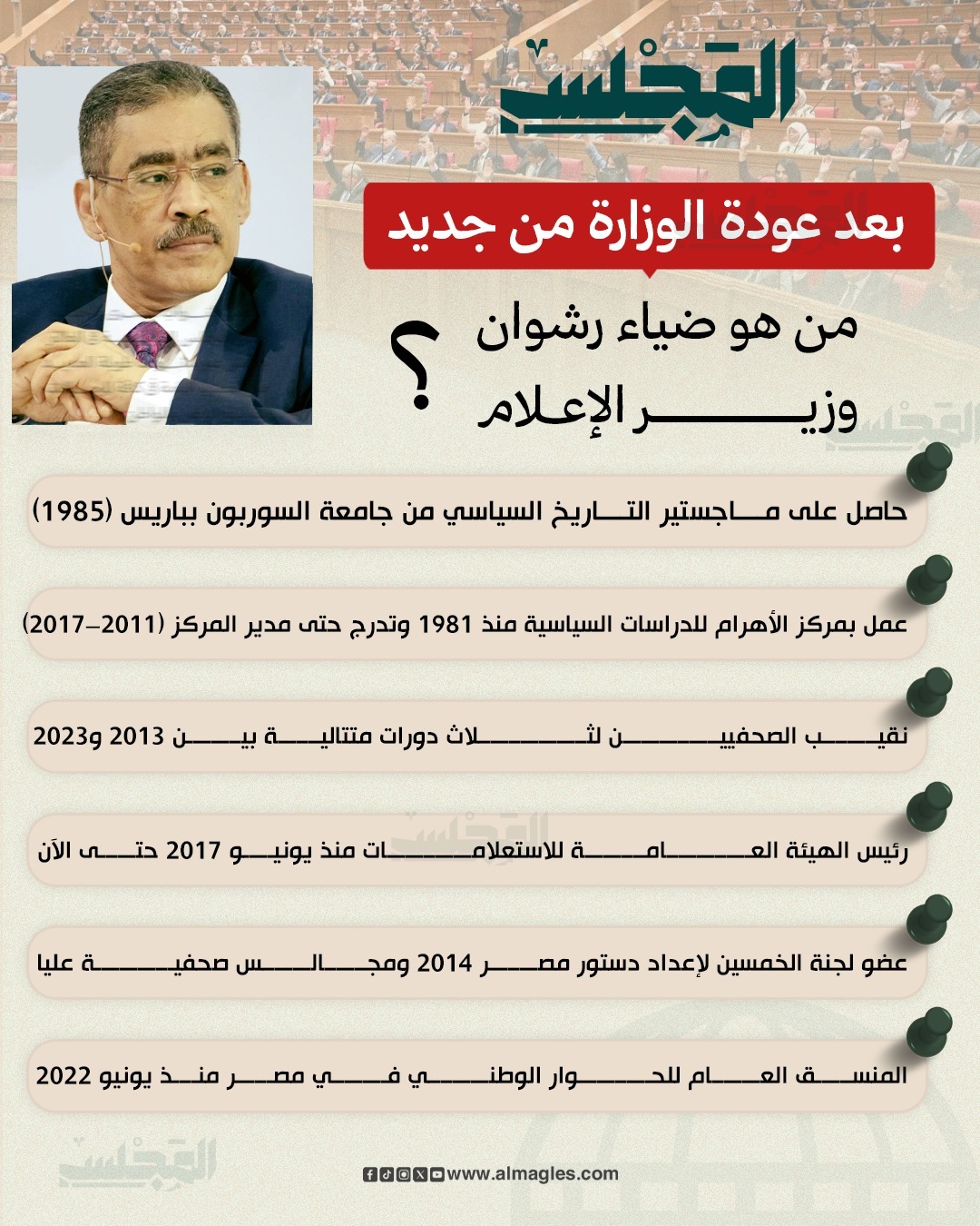 عاد اسم ضياء رشوان إلى صدارة المشهد، لكن هذه المرة من بوابة وزارة الإعلام، بعد اختياره ضمن التشكيل الوزاري الجديد لحكومة الدكتور مصطفى مدبولي، في لحظة دقيقة تتقاطع فيها السياسة بالإعلام، والدبلوماسية بالرأي العام.