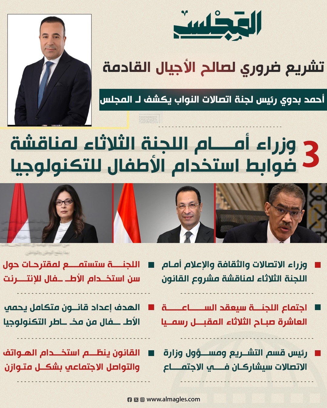 وأكد أحمد بدوي في تصريحات خاصة لموقع المجلس أن الهدف من القانون هو إعداد تشريع متكامل يحمي الأطفال من مخاطر التكنولوجيا، وينظم استخدام الهواتف وتطبيقات التواصل الاجتماعي بشكل متوازن وآمن.
