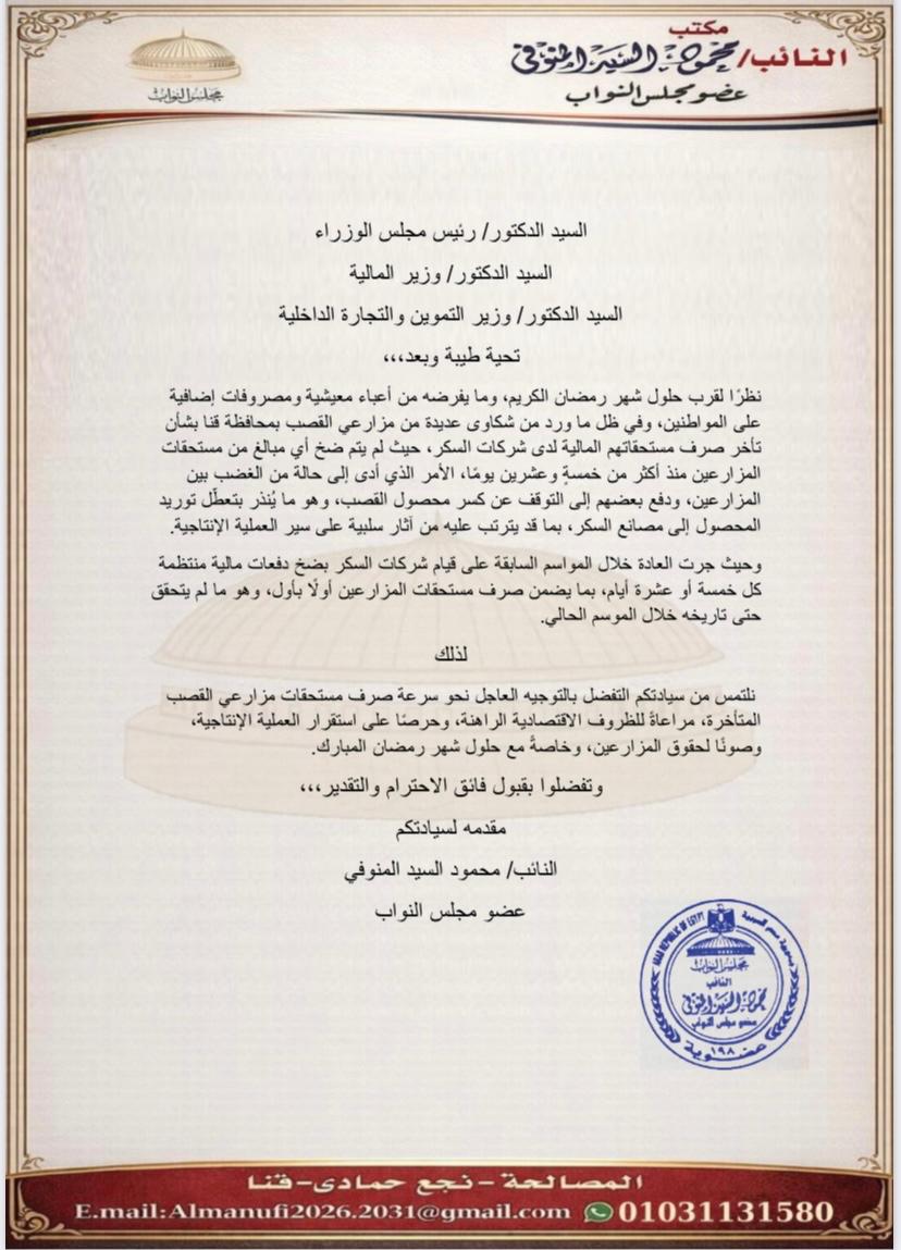 وطالب المنوفي بسرعة توجيه الجهات المختصة نحو صرف المستحقات المتأخرة لمزارعي القصب، مراعاة للظروف الاقتصادية الراهنة، وحرصًا على صون حقوقهم وضمان استمرار عمليات التوريد والإنتاج دون معوقات، خاصة مع شهر رمضان الكريم.