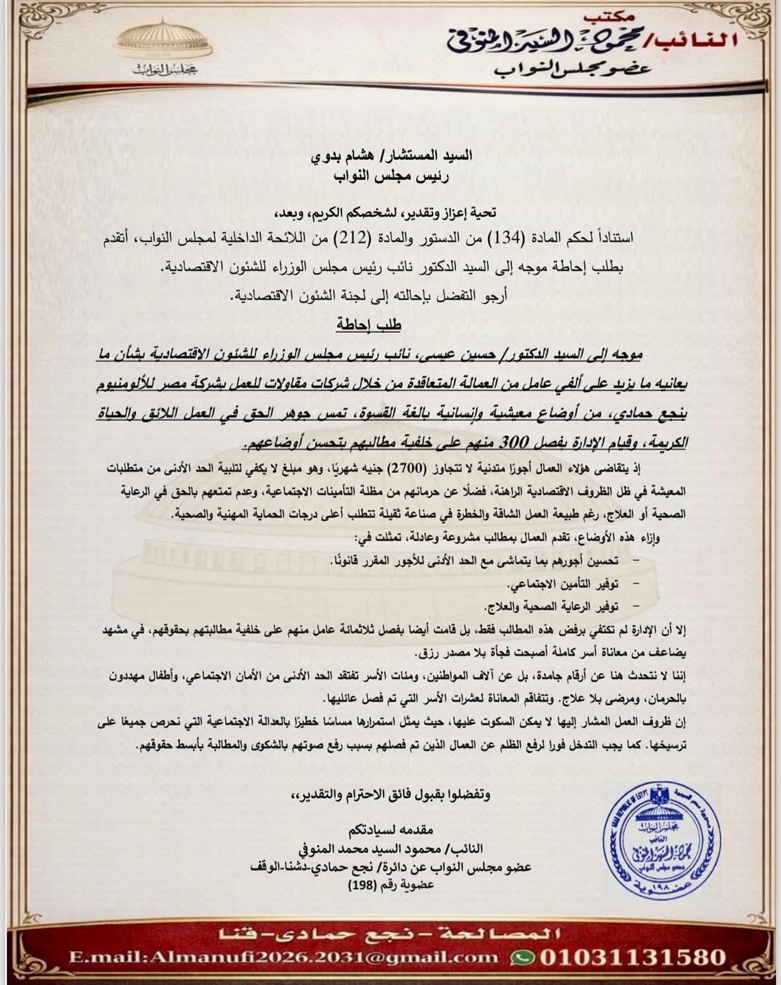 المنوفي يطالب بالتدخل الفوري لبحث أوضاع العمال