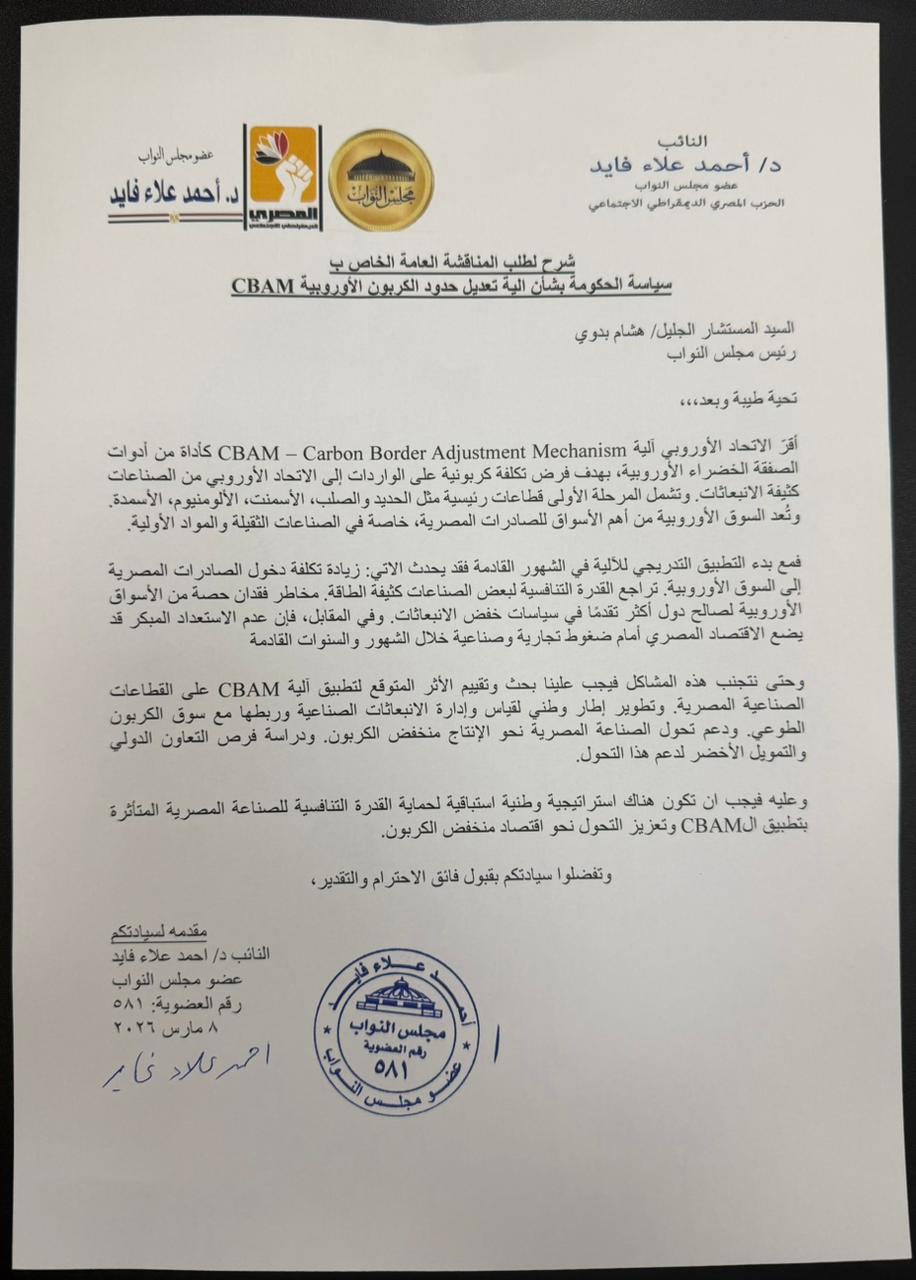 تقدّم النائب أحمد علاء فايد، عضو مجلس النواب عن الحزب المصري الديمقراطي الاجتماعي، بطلب المناقشة العامة إلي المستشار هشام بدوي، رئيس مجلس النواب، بشأن : سياسة الحكومة بشأن الية تعديل حدود الكربون الأوروبية CBAM.