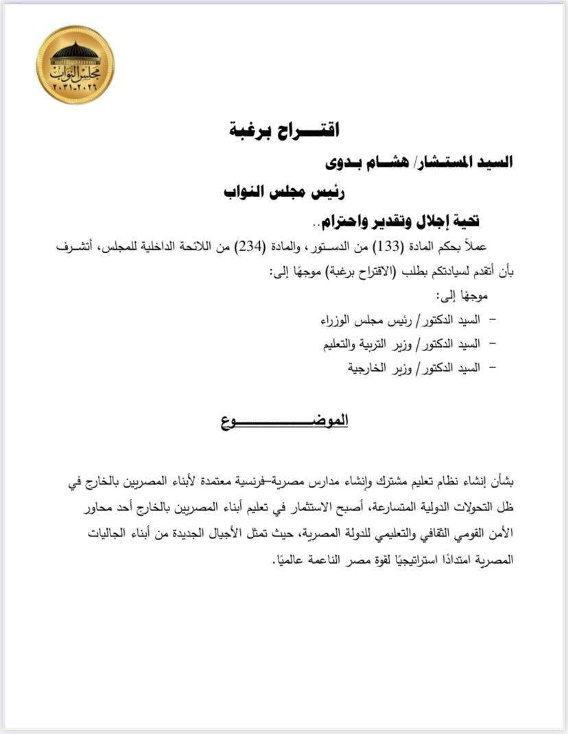 وجاء في المذكرة الإيضاحية للمقترح أن تزايد أعداد المصريين المقيمين بدول أوروبا يفرض تحديات تتعلق بمواءمة متطلبات التعليم في الدول المضيفة مع الحفاظ على الارتباط التعليمي والثقافي بالدولة المصرية، خاصة لدى الأجيال الجديدة من أبناء الجاليات، باعتبارهم امتدادًا لقوة مصر الناعمة عالميًا.