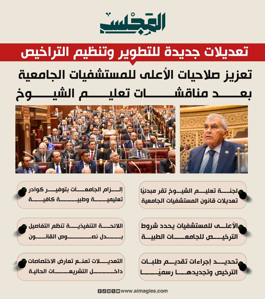 "المجلس" ينشر تعزيز صلاحيات المجلس الأعلى للمستشفيات الجامعية بعد مناقشات من قبل لجنة التعليم بمجلس الشيوخ، كالتالي: