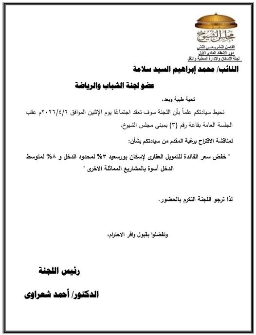 تقدم النائب محمد سلامة عضو لجنة الشباب والرياضة بمجلس الشيوخ، باقتراح برغبة بشأن خفض سعر الفائدة للتمويل العقاري الخاص بإسكان محافظة بورسعيد.
