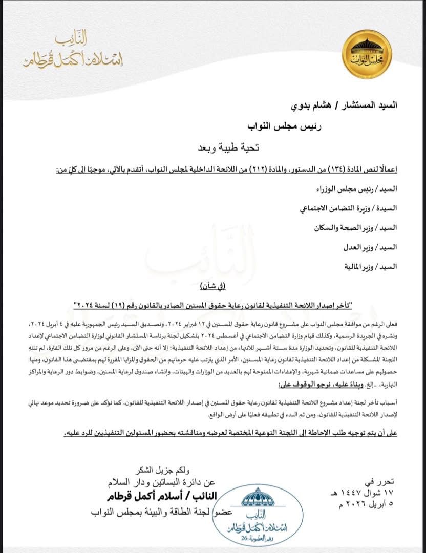 وطالب قرطام بضرورة الوقوف على أسباب تأخر إصدار اللائحة التنفيذية، وسرعة تحديد موعدظ زمني واضح لإصدارها، تمهيدًا لتطبيق القانون بشكل فعلي، بما يضمن حماية حقوق كبار السن وتحسين مستوى الخدمات المقدمة لهم.
