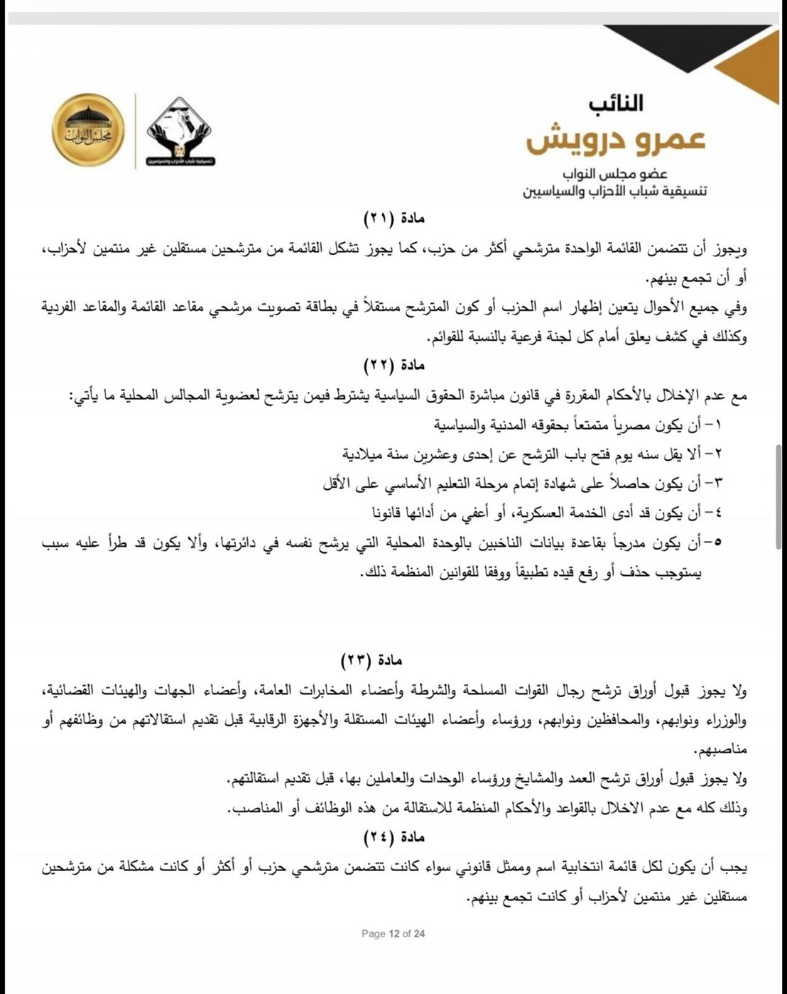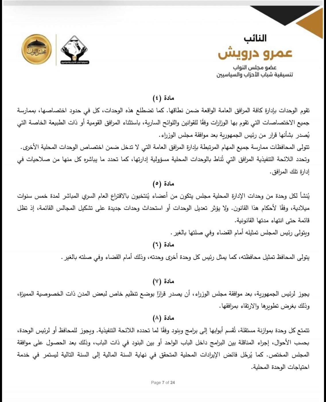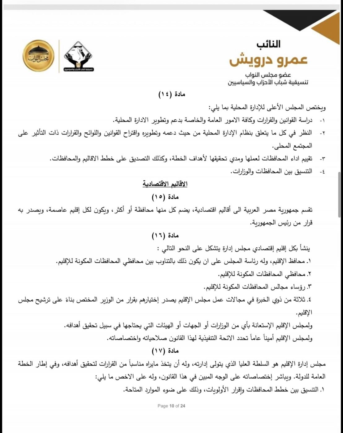 مشروع قانون مقدم من النائب عمرو درويش حول المجالس المحلية