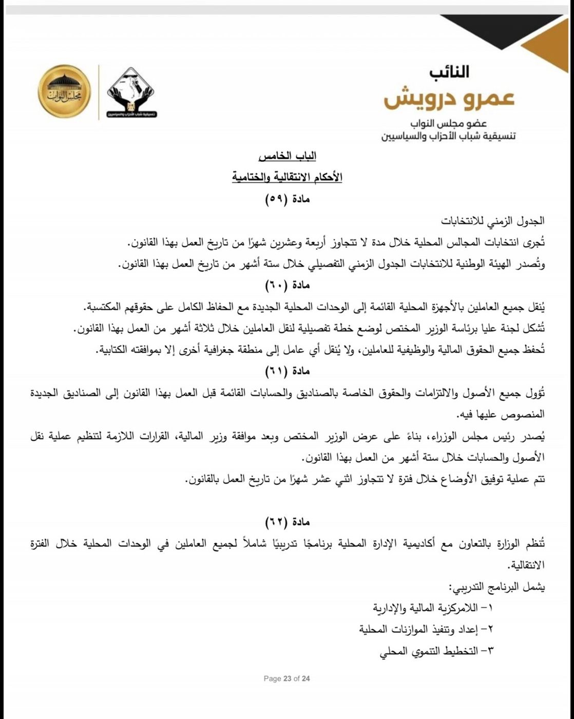 ويأتي مشروع القانون في إطار إعادة تنظيم بنية الإدارة المحلية، وتحديث آليات العمل والرقابة والتمويل، تمهيدًا لتفعيل دور المجالس المحلية المنتخبة بعد سنوات من الغياب.
