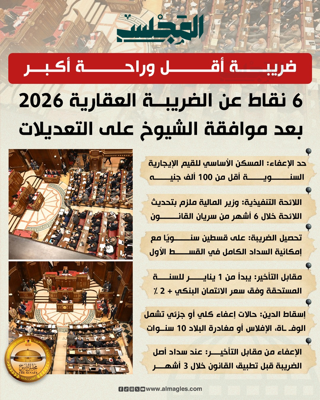 6 نقاط عن الضريبة العقارية 2026 بعد موافقة الشيوخ