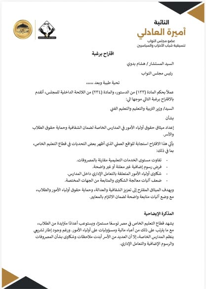 قدمت النائبة أميرة العادلي عن تنسيقية شباب الأحزاب والسياسيين اقتراحًا برغبة إلى وزير التربية والتعليم والتعليم الفني، تدعو فيه إلى إعداد ميثاق وطني ملزم لحقوق أولياء أمور الطلاب في المدارس الخاصة، بهدف تنظيم العلاقة بين ولي الأمر والمدرسة، وضمان الشفافية الكاملة في تقديم الخدمات التعليمية وحماية حقوق الطلاب والأسر.