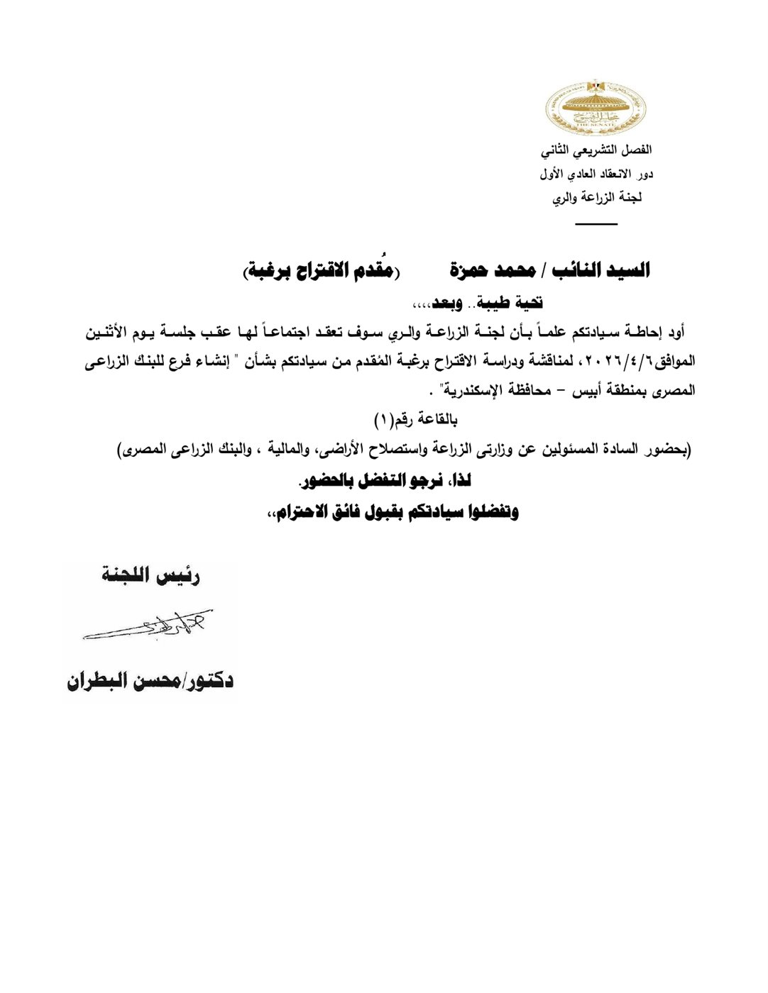 تقدم النائب محمد حمزة، عضو مجلس الشيوخ، أمين العمل الجماهيري بحزب حزب مستقبل وطن بالإسكندرية، بطلب اقتراح برغبة لإنشاء فرع لـ البنك الزراعي المصري بمنطقة أبيس – محرم بك بمحافظة الإسكندرية، وجاء ذلك لخدمة المواطنين والمزارعين والجمعيات الزراعية في المنطقة.