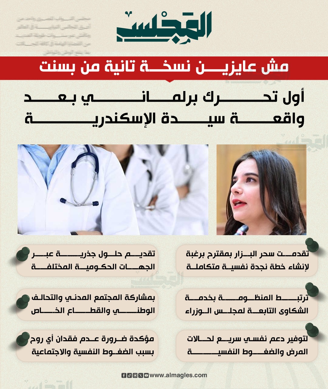 وأضافت أن المقترح يهدف أيضًا إلى تعزيز الوعي المجتمعي بالصحة النفسية، وتقليل الوصمة المرتبطة بها، مع تطوير مسارات إحالة واضحة داخل منظومة الشكاوى الحكومية لضمان سرعة الاستجابة والتوجيه إلى الجهات المختصة.