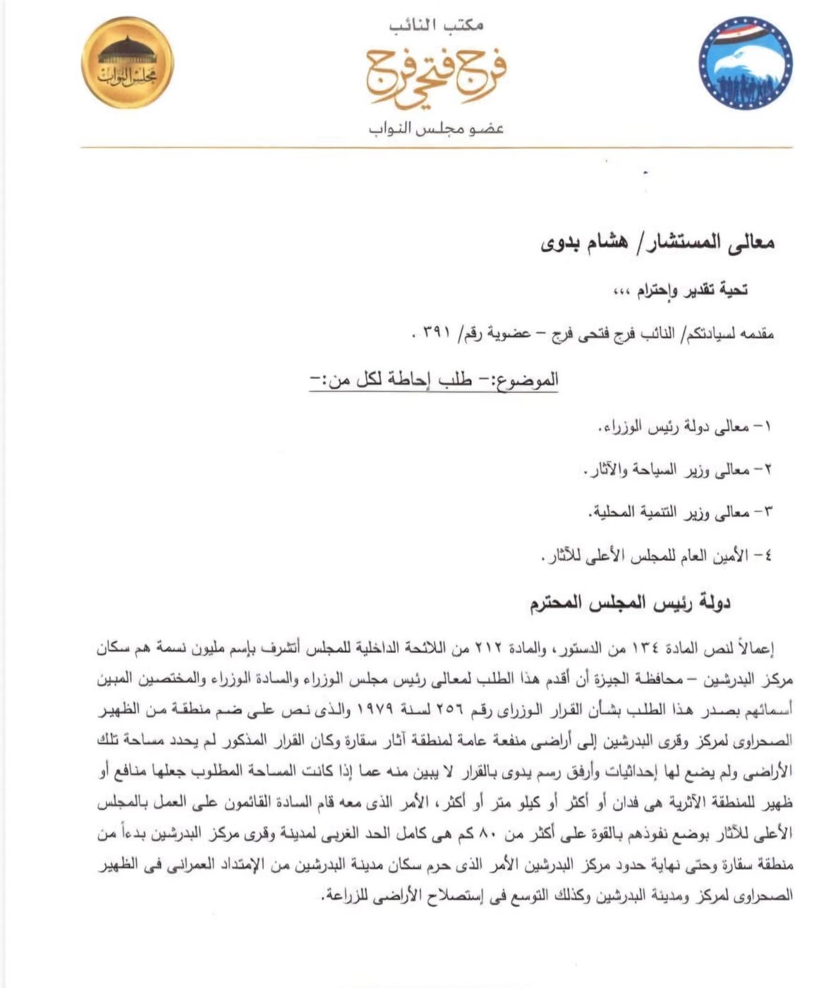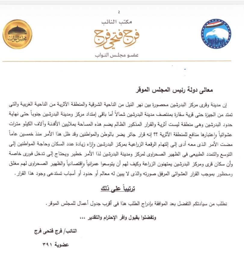 تقدم النائب فرج فتحي فرج عضو مجلس النواب، بطلب إحاطة للمستشار هشام بدوي ،موجه لرئيس الوزراء ـ ووزيري التنمية المحلية ،والأثار، والأمين العام للمجلس الأعلي للآثار ، بشأن القرار الوزاري الذي نص علي ضم منطقة الظهير الصحراوي لمركز وقري البدرشين إلي أراضي منفعة عامة لمنطقة آثار سقارة.
