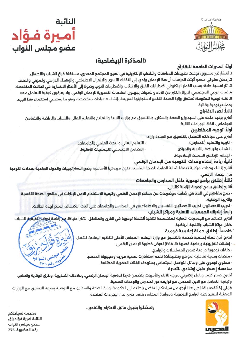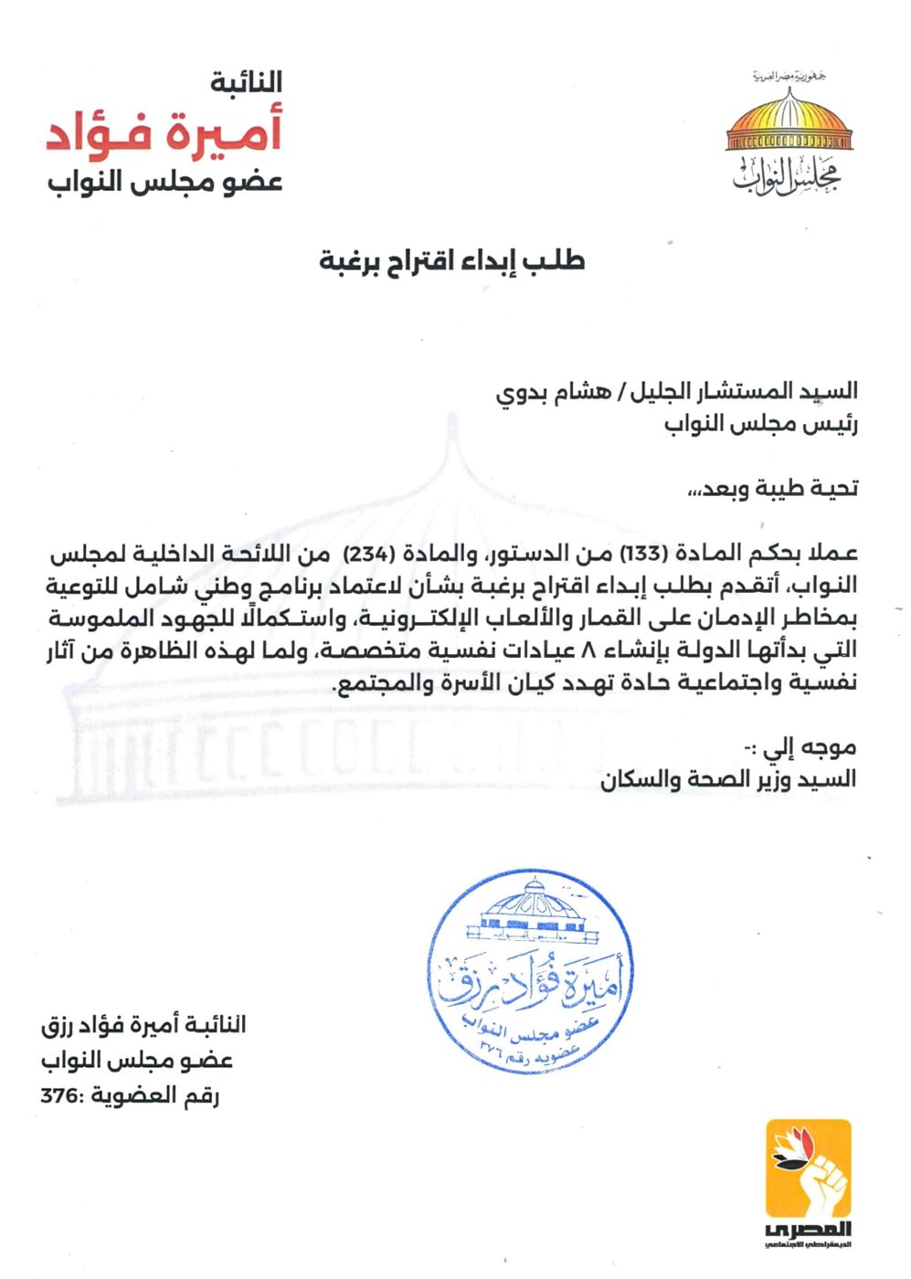 تقدمت النائبة أميرة فؤاد رزق، عضو مجلس النواب عن الحزب المصري الديمقراطي الاجتماعي، باقتراح برغبة إلى المستشار هشام بدوي رئيس مجلس النواب موجه إلى وزير الصحة والسكان ، بشأن لاعتماد برنامج وطني شامل للتوعية بمخاطر الإدمان على القمار والألعاب الإلكترونية، واستكمالًا للجهود الملموسة التي بدأتها الدولة بإنشاء ٨ عيادات نفسية متخصصة، ولما لهذه الظاهرة من آثار نفسية واجتماعية حادة تهدد كيان الأسرة والمجتمع.