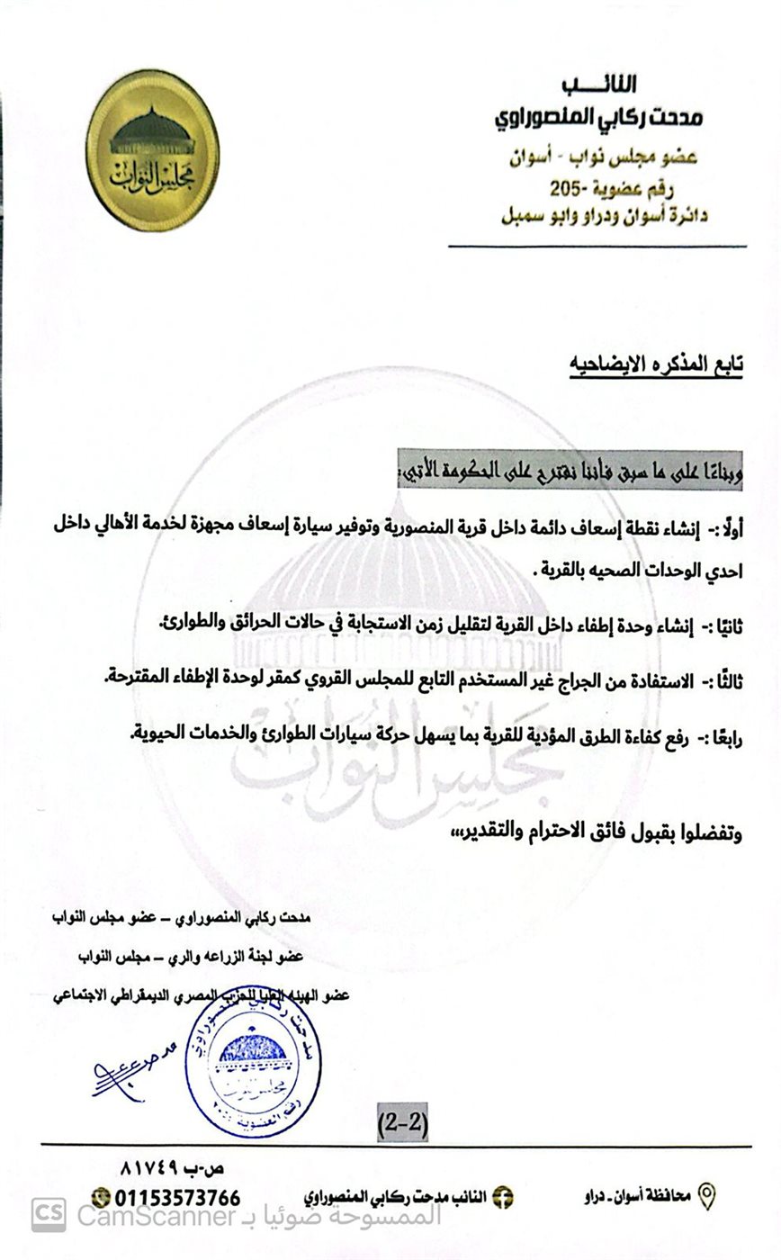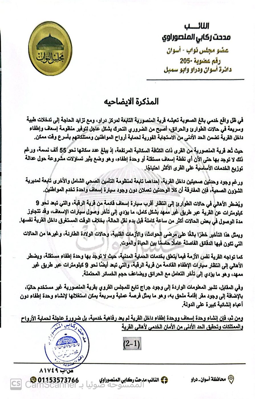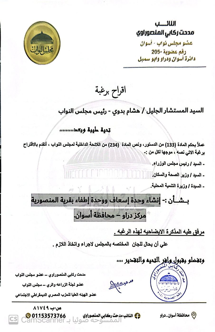 تقدّم النائب مدحت ركابي المنصوراوي عضو مجلس النواب عن الحزب المصري الديمقراطي الاجتماعي باقتراح برغبة إلي رئيس مجلس الوزراء ووزير الصحة والسكان ووزير الداخلية ووزيرة التنمية المحلية ،بشأن إنشاء وحدة إسعاف ووحدة إطفاء بقرية المنصورية – مركز دراو – محافظة أسوان.