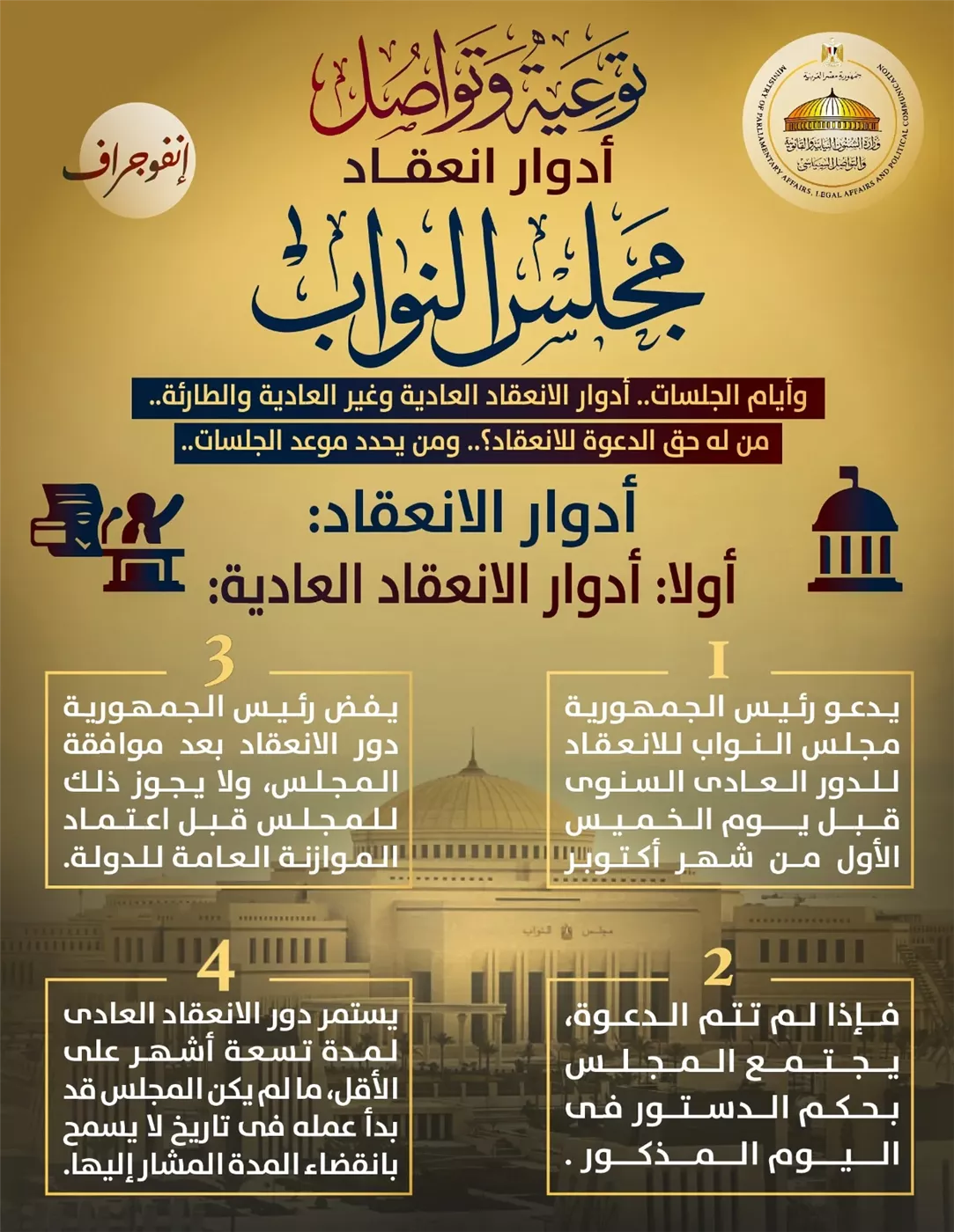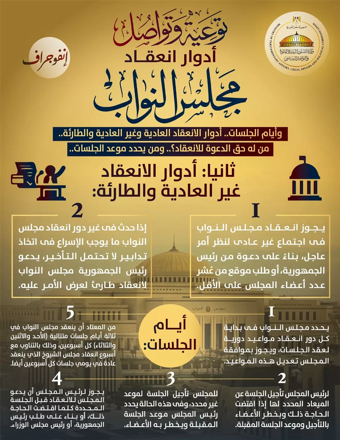أصدرت وزارة الشؤون النيابية والقانونية والتواصل السياسي بيانًا توعويًا جديدًا بعنوان "توعية وتواصل.. أدوار انعقاد مجلس النواب وأيام الجلسات.. أدوار الانعقاد العادية وغير العادية والطارئة.. من له حق الدعوة للانعقاد؟.. ومن يحدد موعد الجلسات.. انفوجراف".