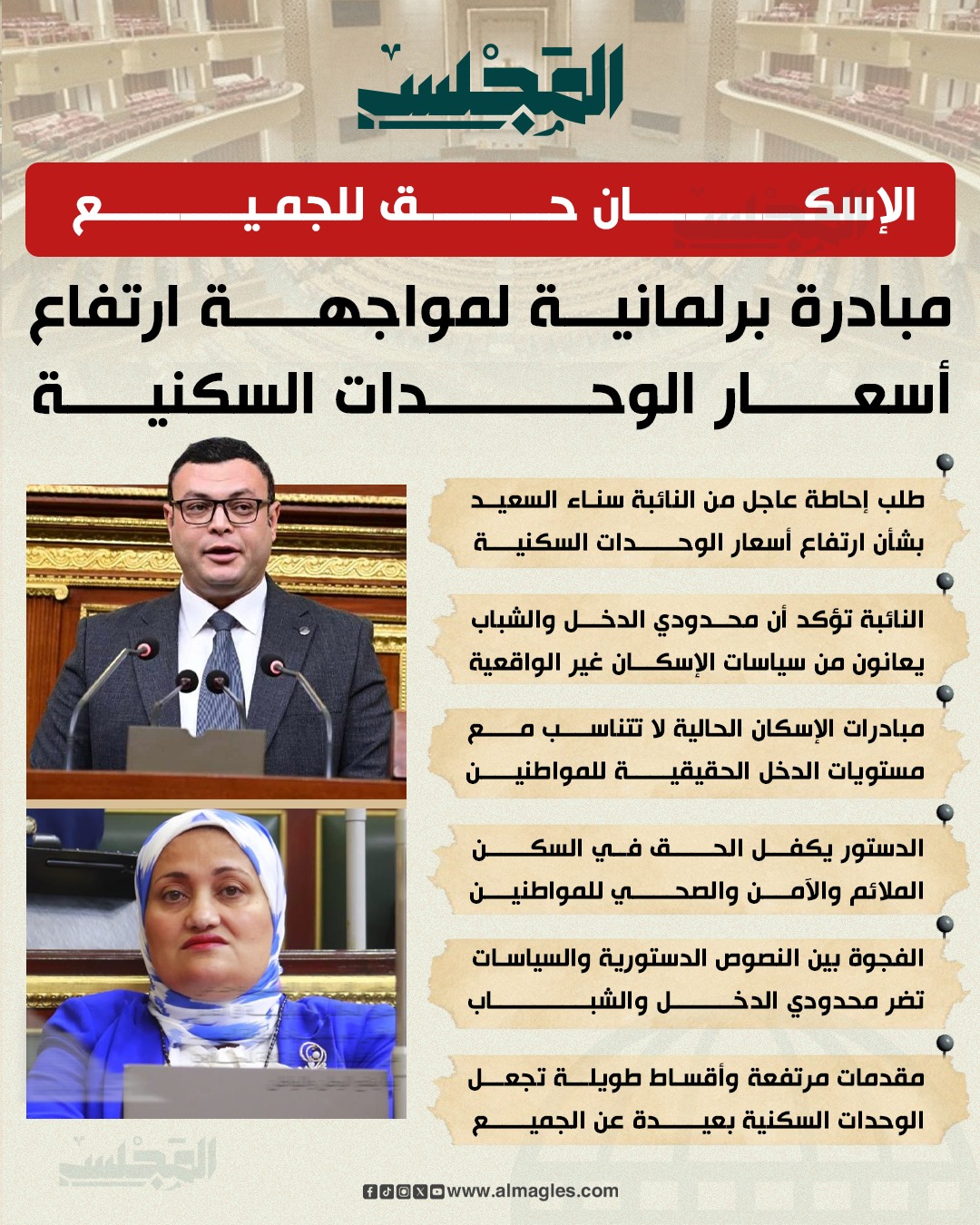 تقدمت النائبة سناء السعيد عضو مجلس النواب عن الحزب المصري الديمقراطي الاجتماعي، بطلب إحاطة موجه إلى رئيس مجلس الوزراء، ووزير الإسكان والمرافق والمجتمعات العمرانية، ووزيرة التخطيط، بشأن السياسات المتبعة في ملف الإسكان، وما تشهده من ارتفاع حاد في أسعار الوحدات السكنية، وطرح مبادرات إسكانية لا تتناسب مع مستويات الدخل الحقيقية للمواطنين، بما يفرغ الحق الدستوري في السكن من مضمونه، ويقصي فعليا محدودي الدخل والشباب.