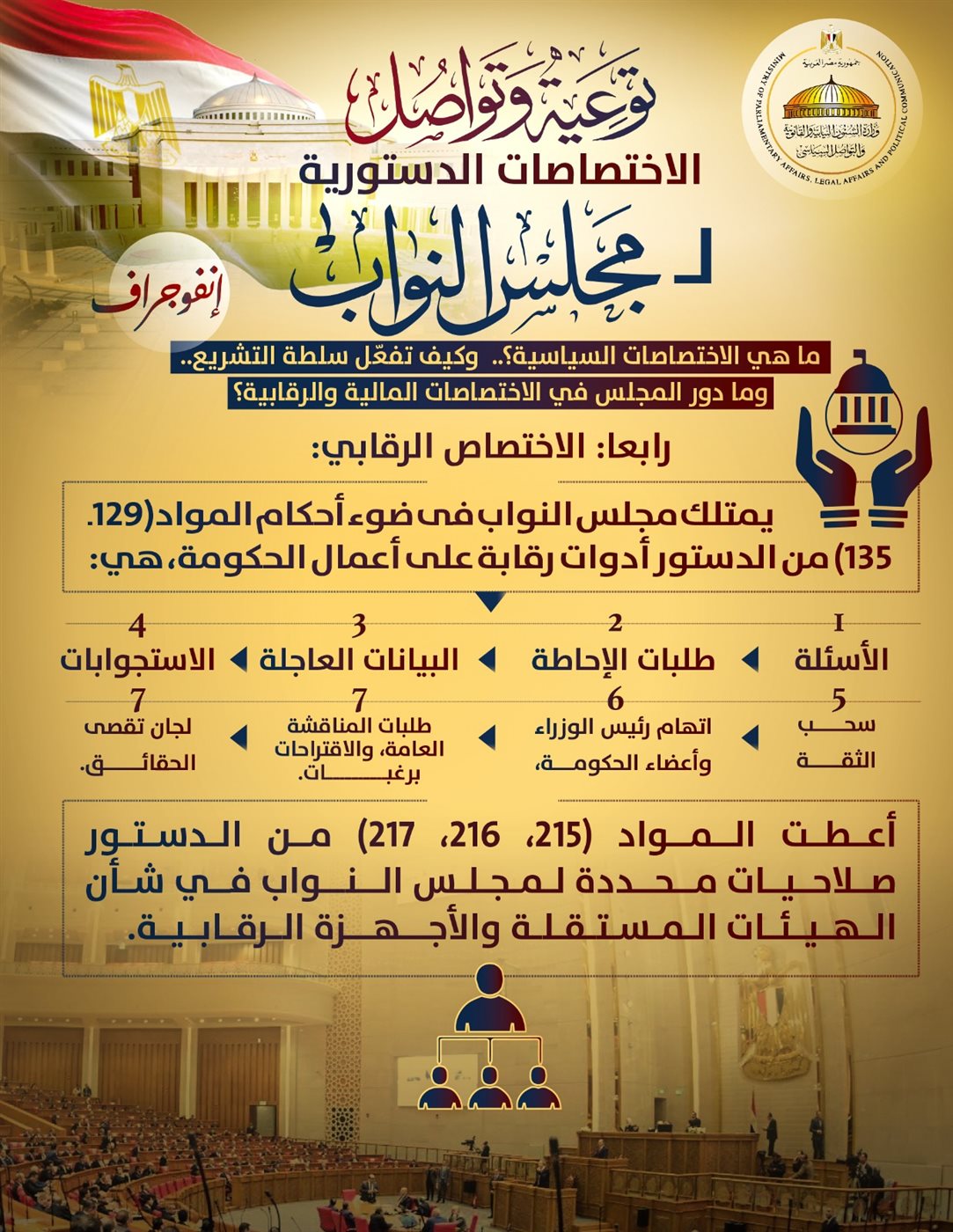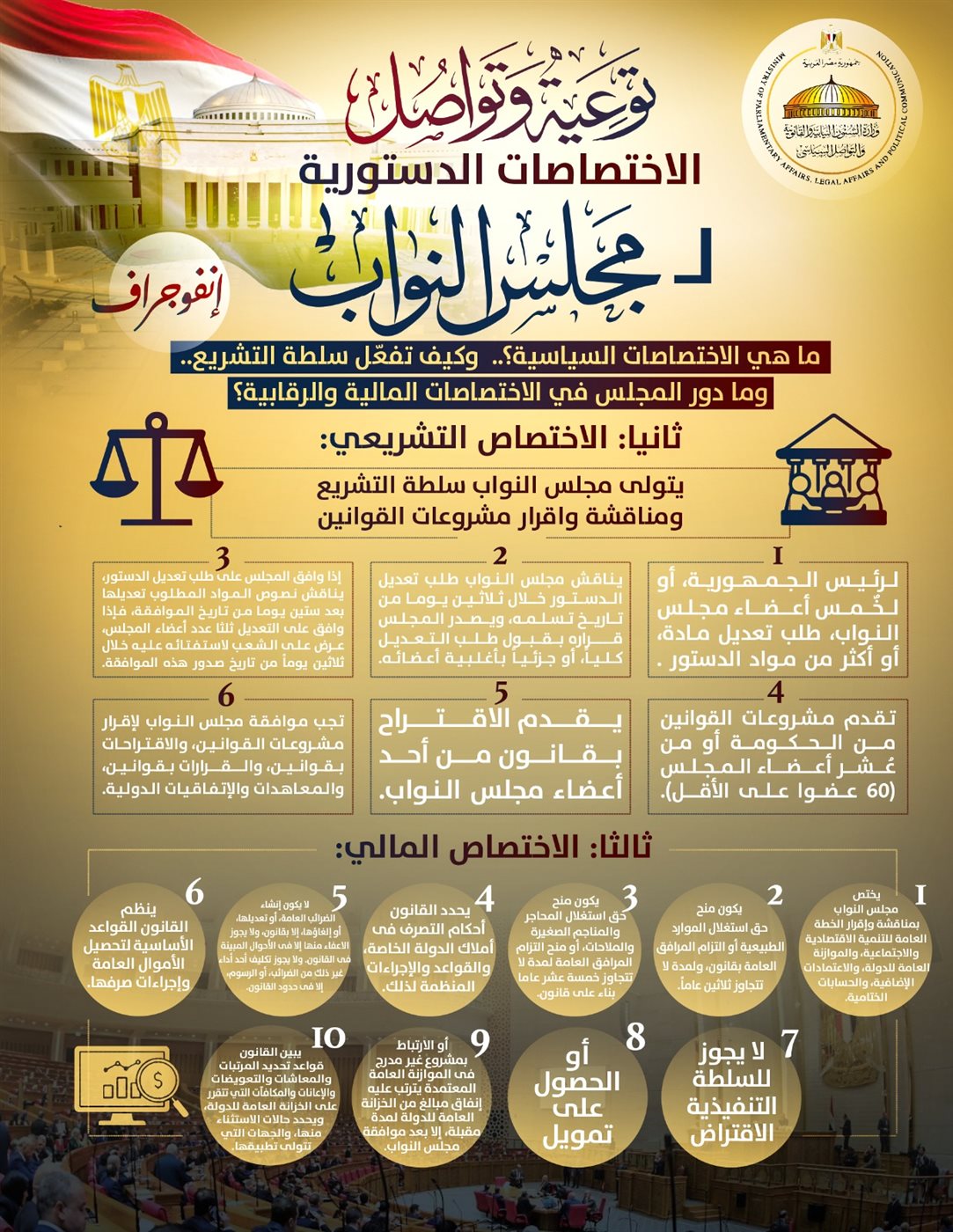 وفي سلسلة اليوم تقدم وزارة الشؤون النيابية والقانونية والتواصل السياسي معلومات عن كل ما يتعلق بالاختصاصات الدستورية لمجلس النواب والدور التشريعي والرقابي والمالي، والصلاحيات والمهام، في شكل إنفوجراف، حتى يتسنى للمواطن تحصيل المعلومة بسهولة ويسر.