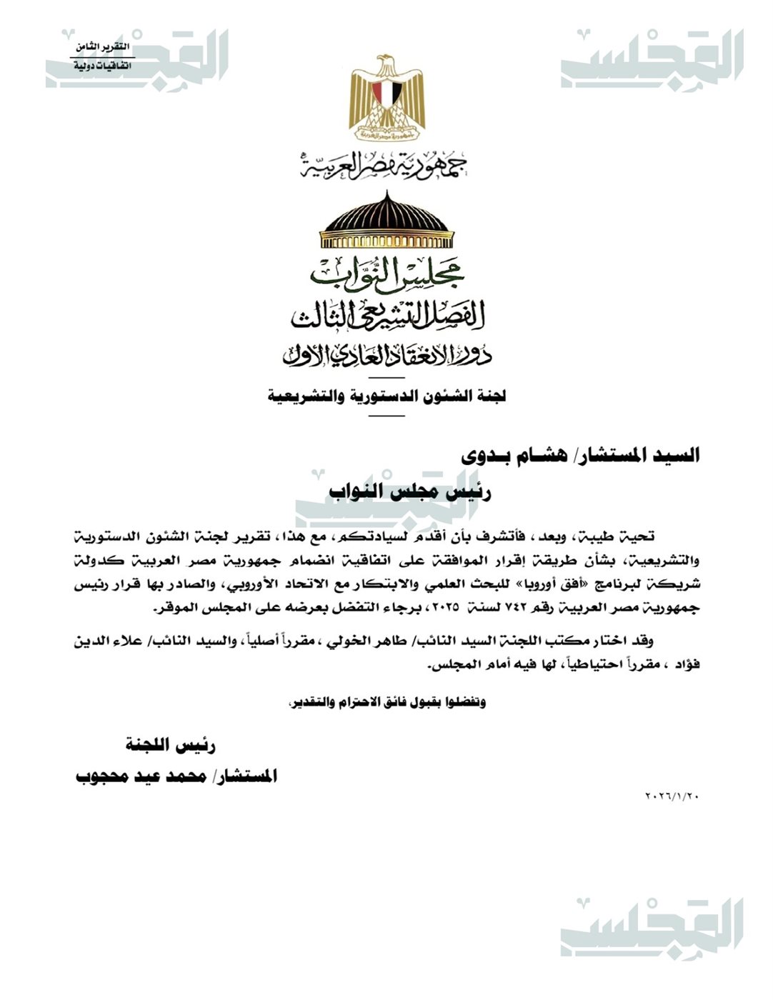 عقدت لجنة الشؤون الدستورية والتشريعية اجتماعها يوم 20 يناير 2026 برئاسة المستشار محمد عيد محجوب وبحضور أعضاء اللجنة لمناقشة طريقة إقرار الموافقة على اتفاقية انضمام جمهورية مصر العربية كدولة شريكة لبرنامج "أفق أوروبا" للبحث العلمي والابتكار مع الاتحاد الأوروبي، والصادر بها قرار رئيس الجمهورية رقم 742 لسنة 2025.