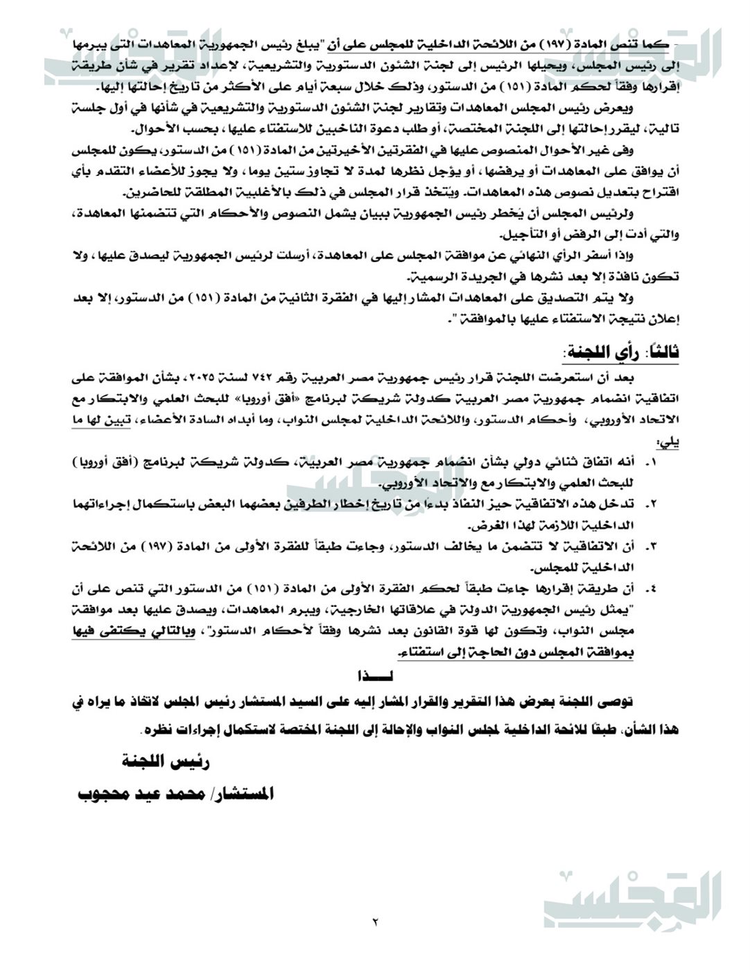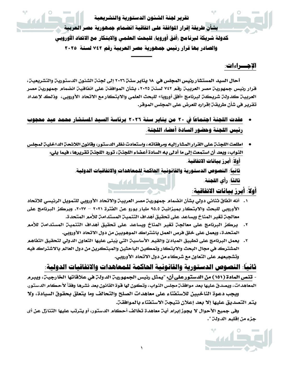 ينفرد موقع المجلس بتوصيات لجنة الشؤون الدستورية والتشريعية بمجلس النواب بعرض الاتفاقية الخاصة بانضمام جمهورية مصر العربية كدولة شريكة لبرنامج "أفق أوروبا" للبحث العلمي والابتكار على رئيس المجلس لاستكمال الإجراءات اللازمة وفقًا للائحة الداخلية.