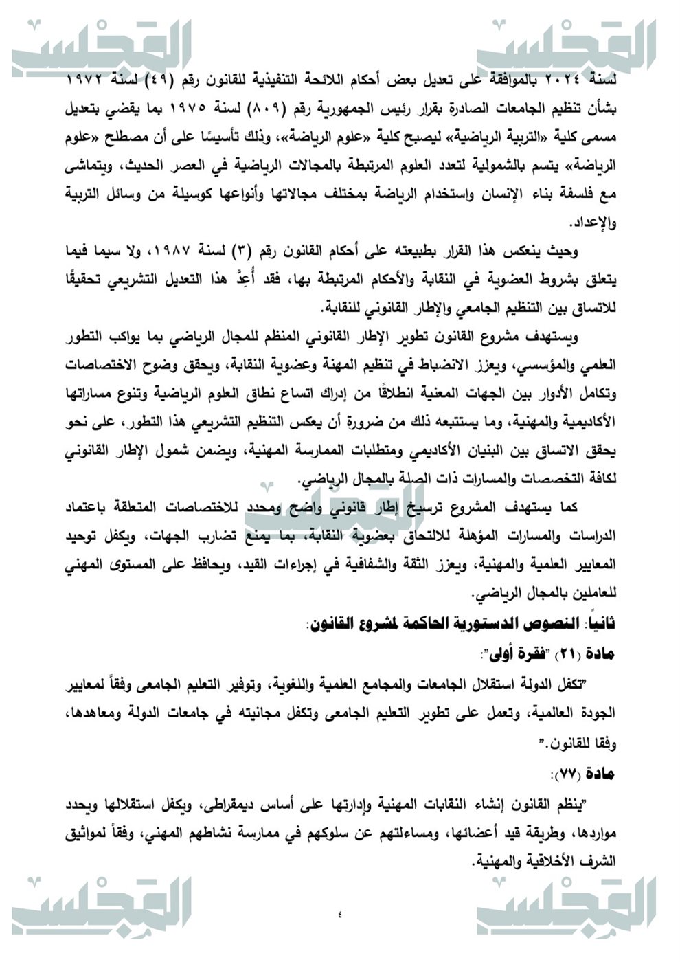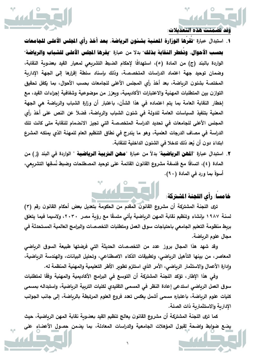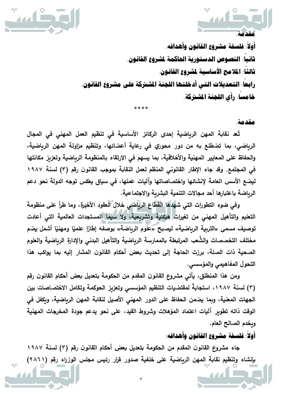 والذي يهدف إلى تطوير الإطار القانوني المنظم للمجال الرياضي بما يواكب التطور العلمي والمؤسسي، ويعزز الانضباط في تنظيم المهنة وعضوية النقابة، ويحقق وضوح الاختصاصات وتكامل الأدوار بين الجهات المعنية انطلاقًا من إدراك اتساع نطاق العلوم الرياضية وتنوع مساراتها الأكاديمية والمهنية، وما يستتبعه ذلك من ضرورة أن يعكس التنظيم التشريعي هذا التطور، على نحو يحقق الاتساق بين البنيان الأكاديمي ومتطلبات الممارسة المهنية، ويضمن شمول الإطار القانوني لكافة التخصصات والمسارات ذات الصلة بالمجال الرياضي.