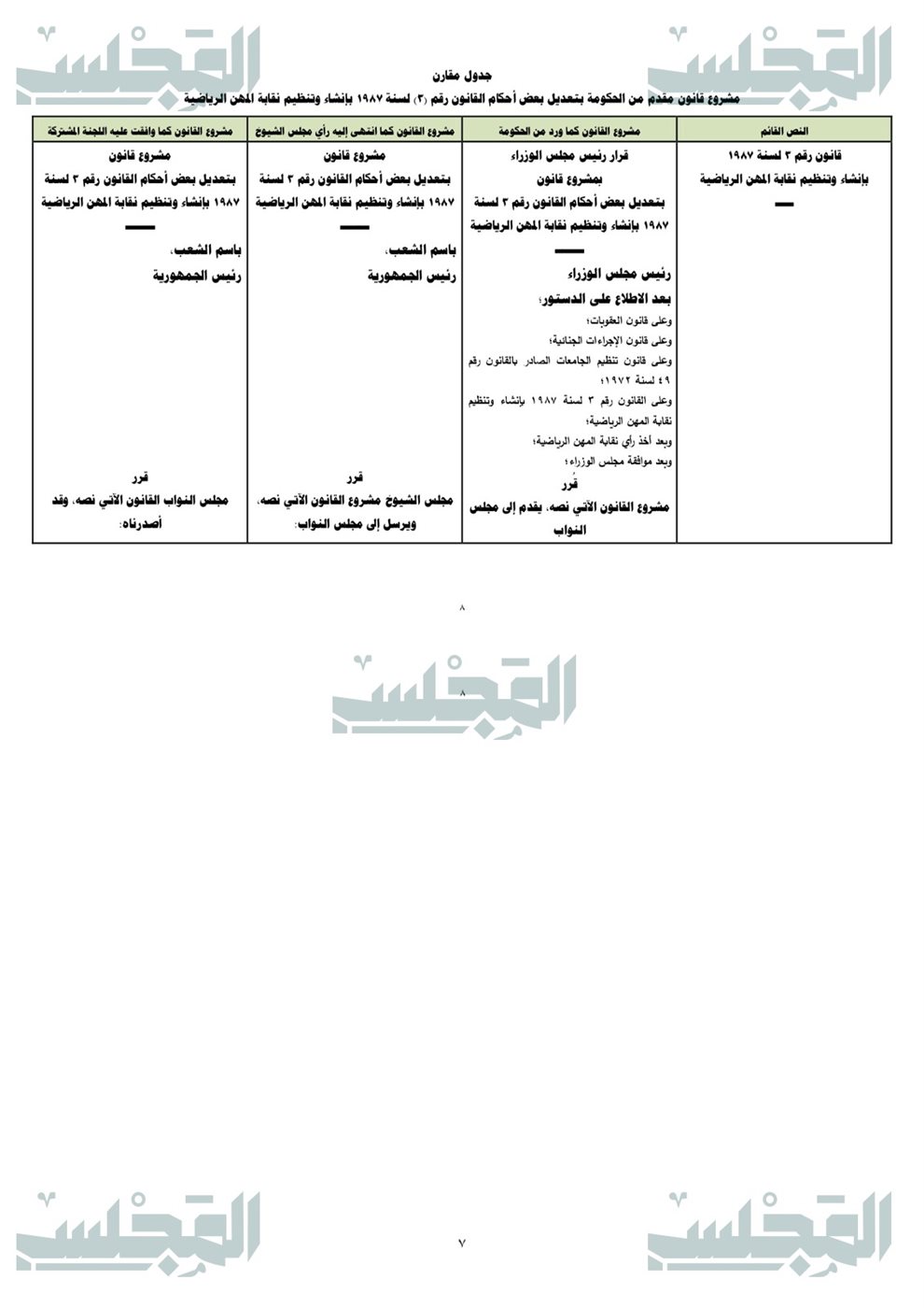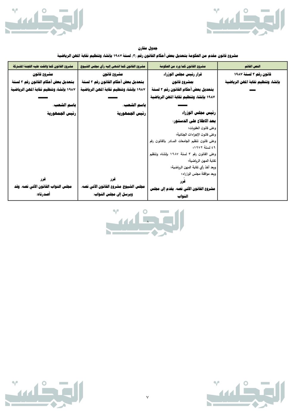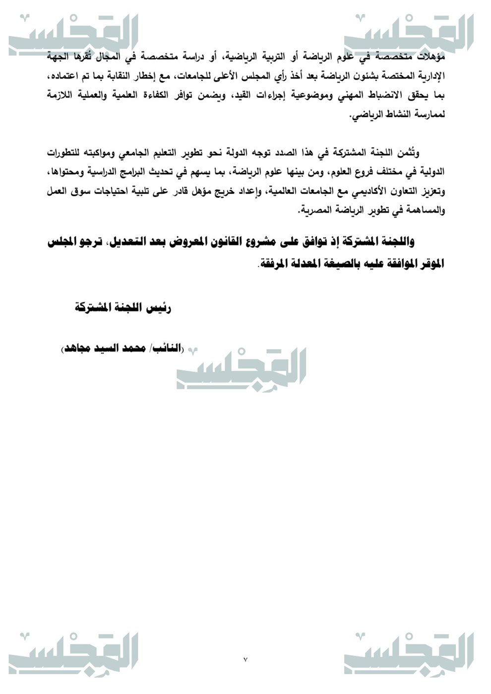 والذي يهدف إلى تطوير الإطار القانوني المنظم للمجال الرياضي بما يواكب التطور العلمي والمؤسسي، ويعزز الانضباط في تنظيم المهنة وعضوية النقابة، ويحقق وضوح الاختصاصات وتكامل الأدوار بين الجهات المعنية انطلاقًا من إدراك اتساع نطاق العلوم الرياضية وتنوع مساراتها الأكاديمية والمهنية، وما يستتبعه ذلك من ضرورة أن يعكس التنظيم التشريعي هذا التطور، على نحو يحقق الاتساق بين البنيان الأكاديمي ومتطلبات الممارسة المهنية، ويضمن شمول الإطار القانوني لكافة التخصصات والمسارات ذات الصلة بالمجال الرياضي.