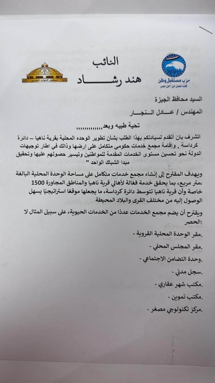 وطالبت النائبة محافظ الجيزة بسرعة دراسة المقترح والتنسيق مع الجهات المعنية لتنفيذه، بما يسهم في تلبية احتياجات أهالي قرية ناهيا ودائرة كرداسة، ويحقق الصالح العام..