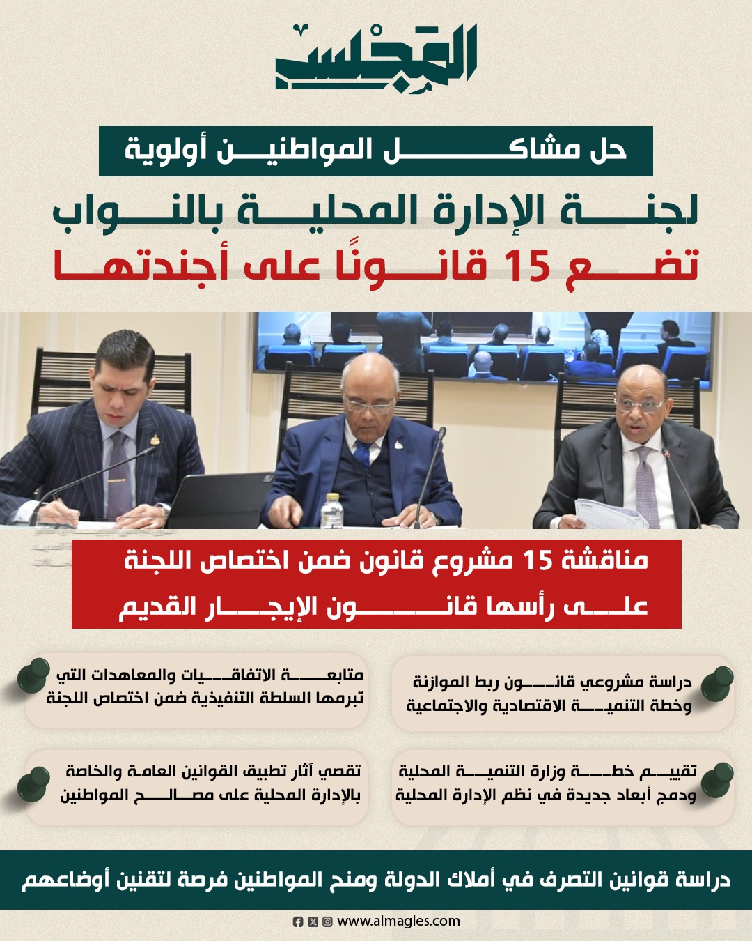 وأكدت اللجنة، أنها ستهتم بتقصى آثار تطبيق القوانين العامة والقوانين المتعلقة بالإدارة المحلية والتي تمس مصالح المواطنين الأساسية، ودراسة الأثر التشريعي لهذه القوانين، وتشمل هذه القوانين: القانون رقم 168 لسنة 2025، بإصدار قانون بعض قواعد وإجراءات التصرف في أملاك الدولة الخاصة، ولائحته التنفيذية الصادرة بقرار رئيس مجلس الوزراء رقم 200 لسنة 2026، وذلك بهدف مراعاة البعدين الاقتصادي والاجتماعي للمواطنين ومنح واضعي اليد فرصة لتقنين أوضاعهم متى توافرت في حقهم ضوابط وشروط التقنين.