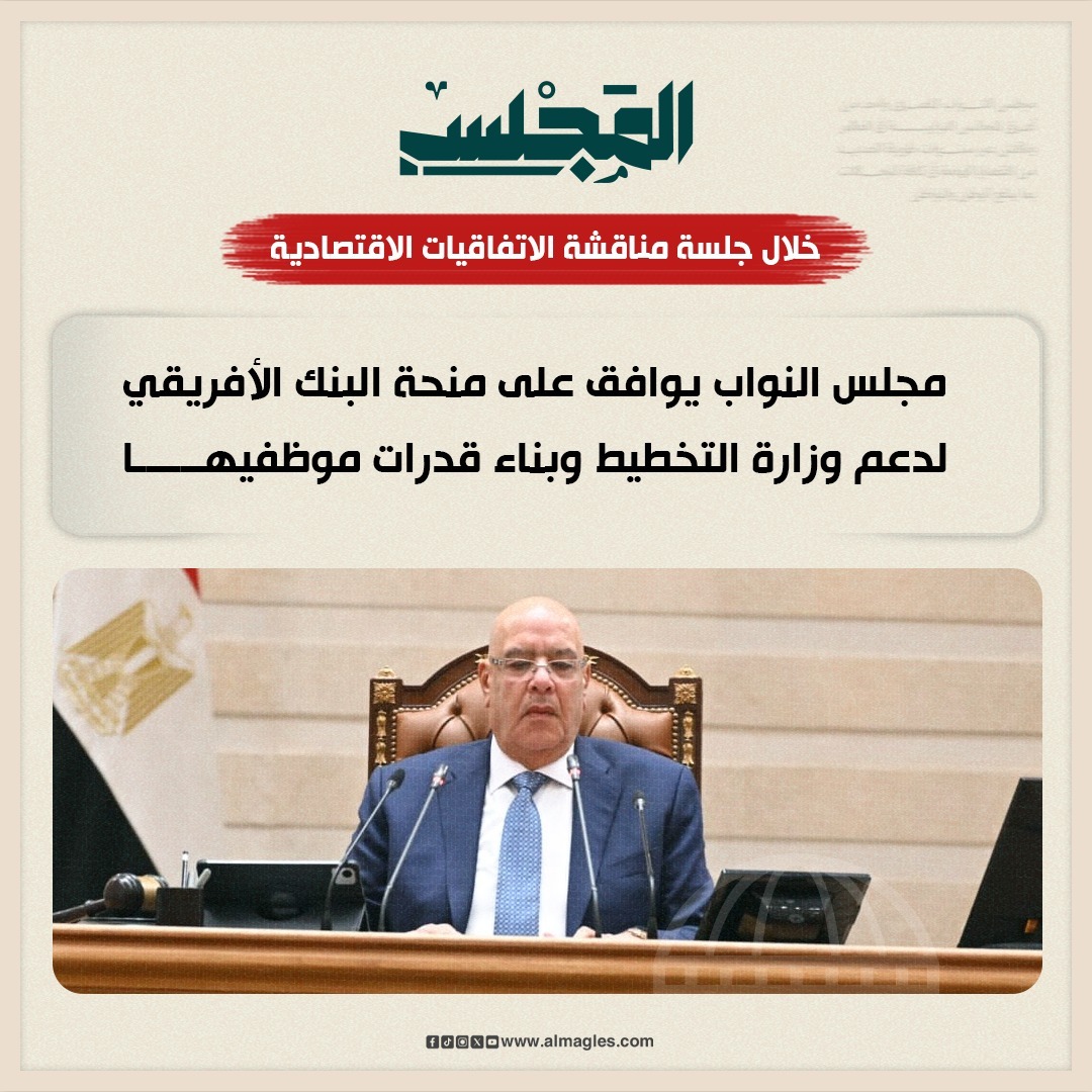 وافق مجلس النواب، على قرار رئيس جمهورية مصر العربية رقم 735 لسنة 2025 على طريقة إقرار الموافقة على اتفاق المنحة المقدمة من صندوق المساعدة الفنية للبلدان ذات الدخل المتوسط (MIC-TAF) بين حكومة جمهورية مصر العربية، وبنك التنمية الإفريقي.