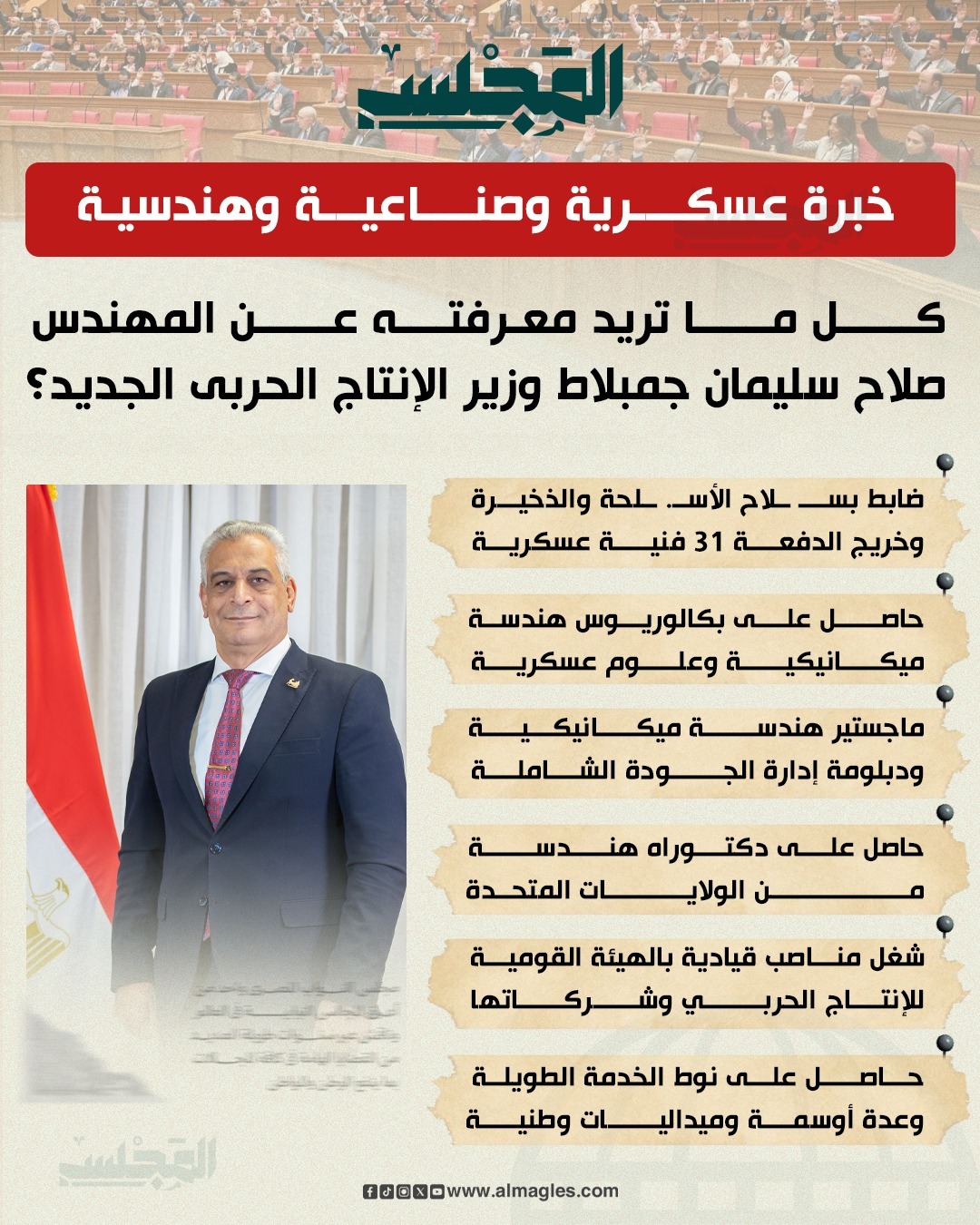 تم تعيين اللواء مهندس صلاح سليمان جمبلاط وزيرًا للإنتاج الحربي في الحكومة الجديدة، ليواصل مسيرة طويلة من الخبرة العسكرية والهندسية والإدارية داخل الهيئة القومية للإنتاج الحربي. ويجمع وزير الإنتاج الحربي الجديد بين الكفاءة الفنية والخبرة القيادية، مما يؤهله لإدارة منظومة الإنتاج الحربي وفق أعلى معايير الجودة والتطوير التكنولوجي.