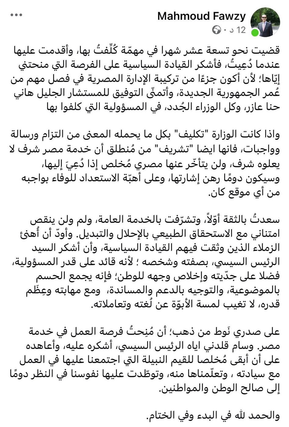 وقال في رسالته إنه قضى نحو تسعة عشر شهرًا في مهمة كُلِّف بها، لبّى نداءها حين دُعي إليها، متقدمًا بالشكر إلى القيادة السياسية على منحه شرف أن يكون جزءًا من منظومة الإدارة المصرية في فصل مهم من تاريخ الدولة. كما أعرب عن خالص تمنياته بالتوفيق للمستشار الجليل هاني حنا عازر، ولجميع الوزراء الجدد، في أداء المسؤوليات الوطنية الموكلة إليهم.