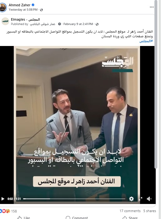 نشر الفنان أحمد زاهر عبر حسابه الشخصي على فيسبوك فيديو خاص من موقع المجلس يوثق حضوره اجتماع لجنة الاتصالات وتكنولوجيا المعلومات، برئاسة النائب أحمد بدوي، لمناقشة خطة الدولة لإعداد مشروع قانون ينظم استخدام الأطفال لمواقع وتطبيقات التواصل الاجتماعي.
